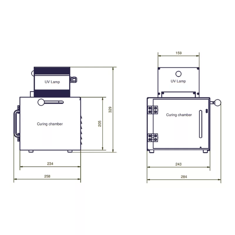 Equipped with a smooth-running shutter system and optimized reflector geometry, the UV 100W Curing Cabinet ensures uniform irradiation with a high level of consistency. Its working chamber of 180 x 180 x 180 mm makes it ideal for small components, while the compact design allows seamless integration into laboratory or production environments.